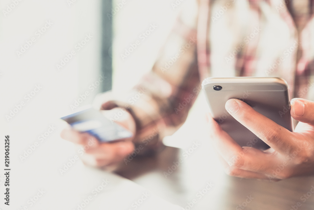 Close up hand of woman using smart phone for online shopping at home. Online shopping concept