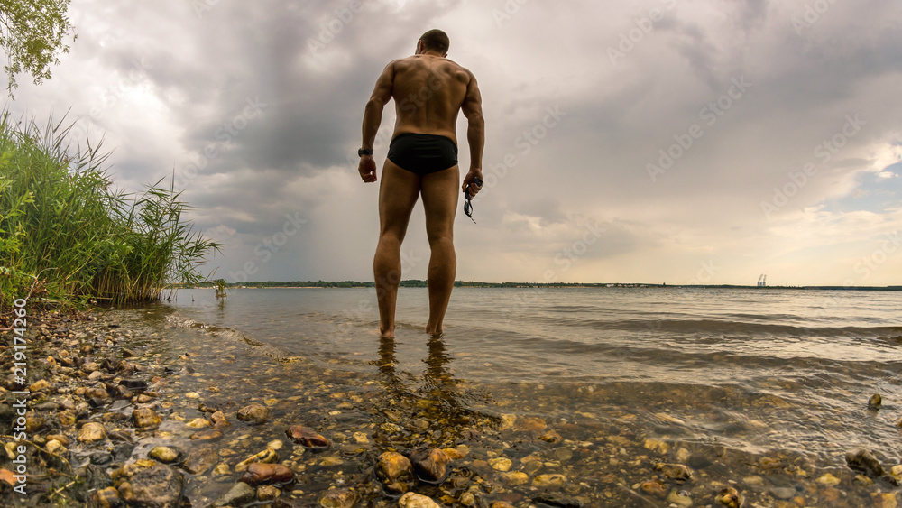 Trainierter Mann geht in einen See zum Schwimmen bei heranziehendem Unwetter