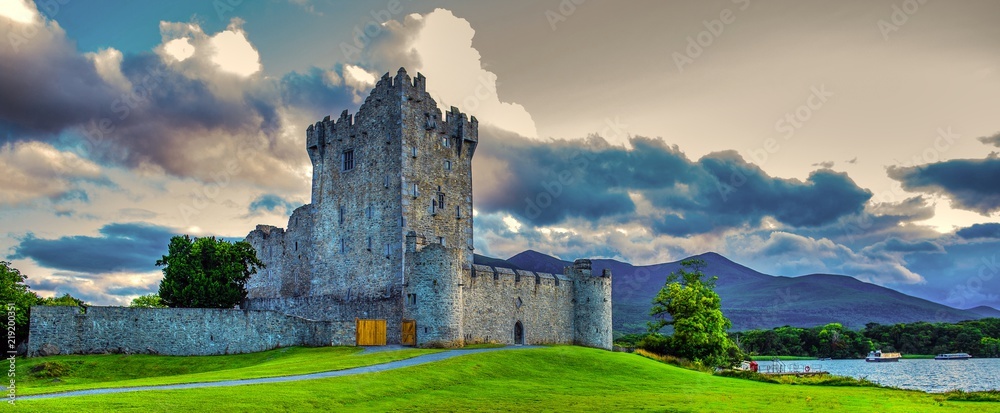 Idyllic landscape of Ross Castle in the Killarney National Park in Ireland. Travel by car through the Ring of Kerry.