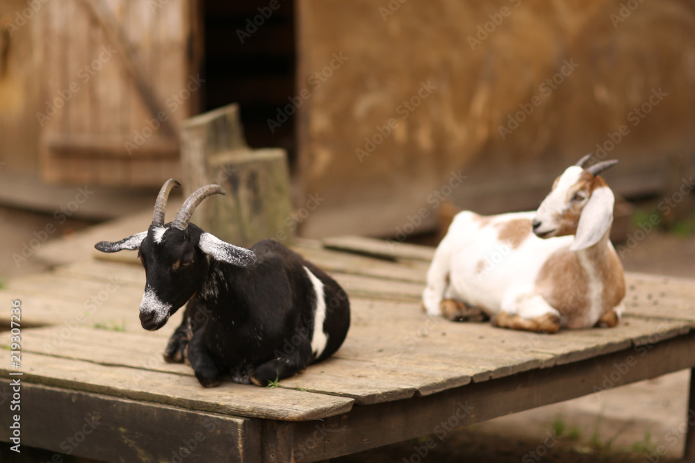 two goats relaxing in zoo paddock after feeding close up summer outdoor photo