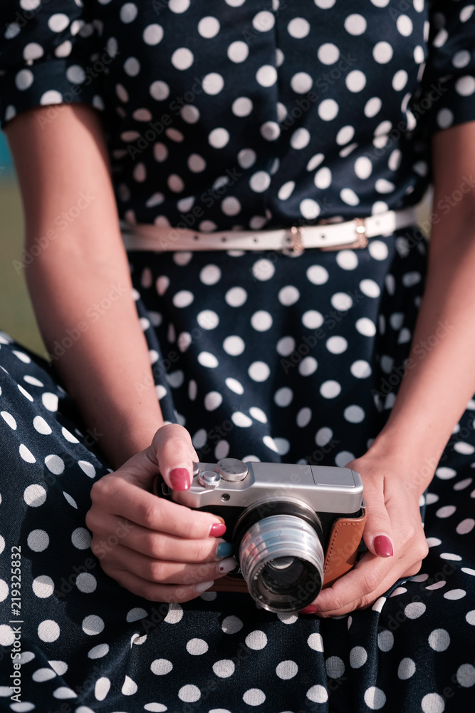 Oldschool mirrorless camera in the hands of a girl in a white and black dot dress