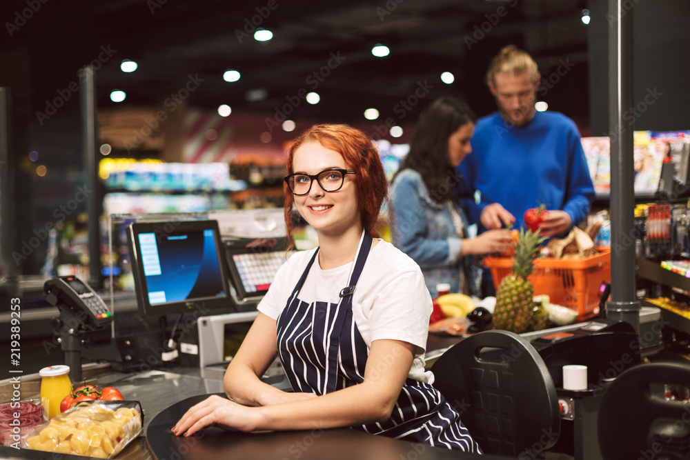 Young smiling cashier in eyeglasses and striped apron happily looking in camera while working in modern supermarket with customers on background