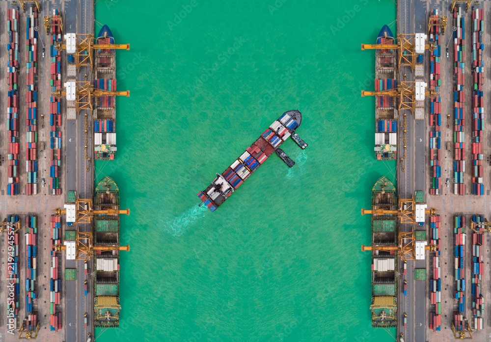 Aerial view container ship from sea port working for delivery containers shipment. Suitable use for transport or import export to global logistics concept.