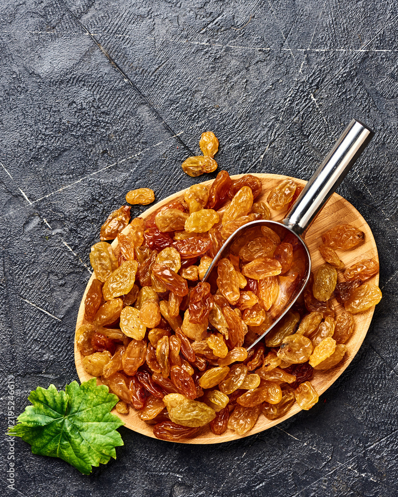 Yellow raisins on black concrete background with scoop. Top view of dried grapes.