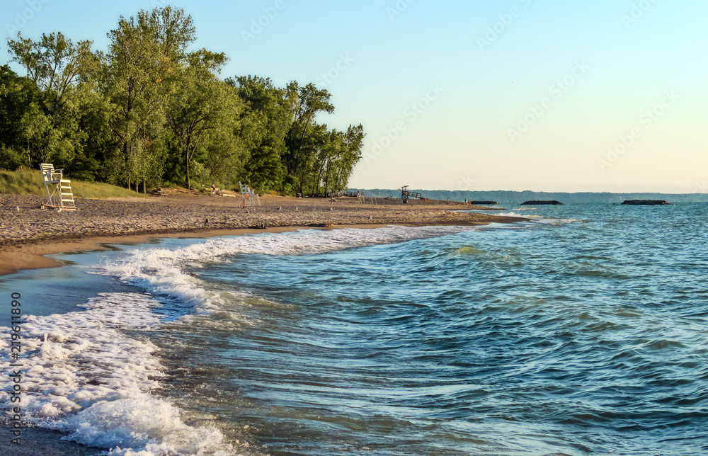Deserted beach with lifeguard chairs and trees in background on Presque Isle on Lake Erie