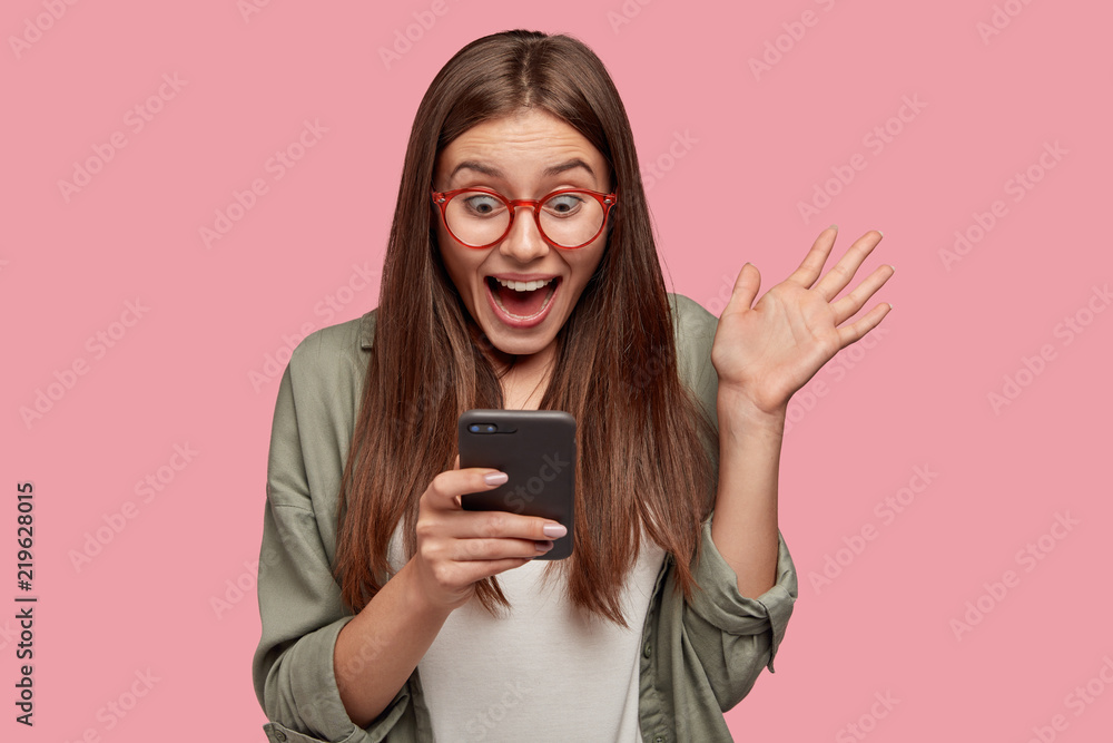 Overjoyed happy excited female glad to recieve text message informing about salary, rejoices good news, stares at mobile phone, gestures actively from happiness, stands indoor alone. Reaction concept
