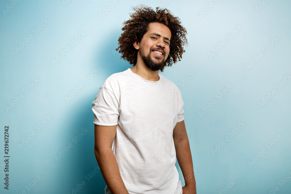 Contended smile on the face of a curly-headed brunet man wearing white T-shirt. A person with a look of pleasure.