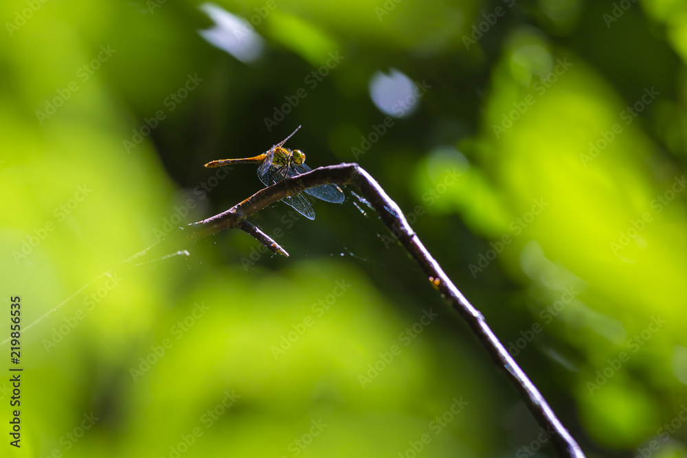 Closeup of a female Ruddy darter (Sympetrum sanguineum) resting in sunlight in a meadow