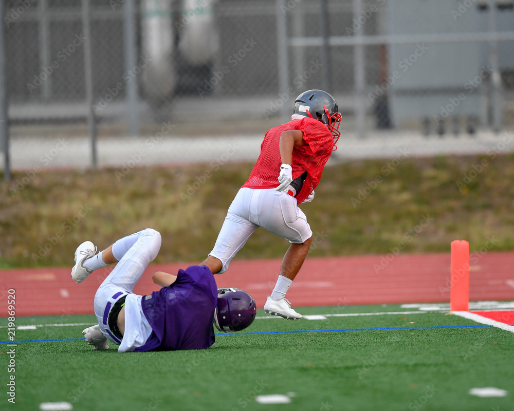 Boy football players running with the ball and scoring a touchdown during a game