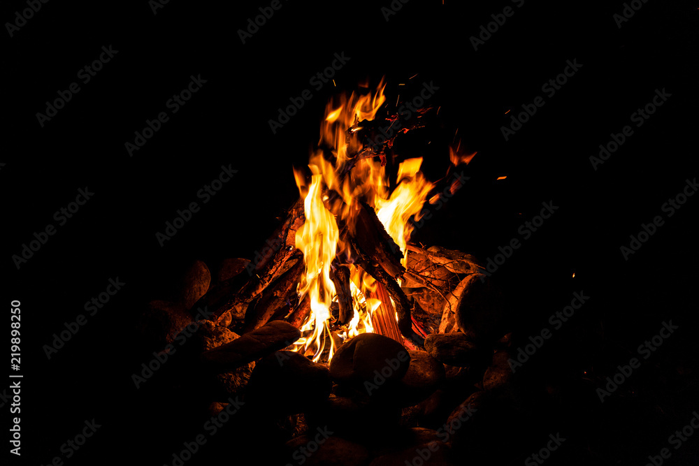Close-up of a fire with an orange and red flame burning in the dark