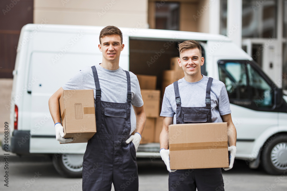 Two young handsome smiling workers wearing uniforms are standing next to the van full of boxes holding boxes in their hands. House move, mover service.