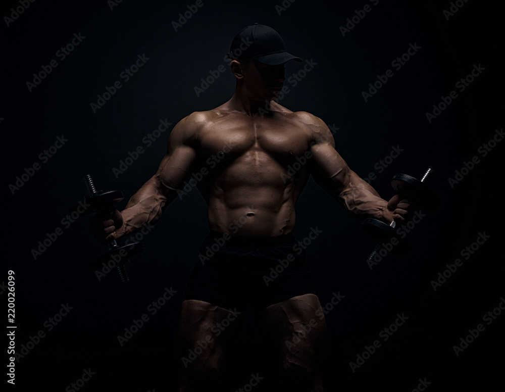 Muscular bodybuilder guy doing exercises