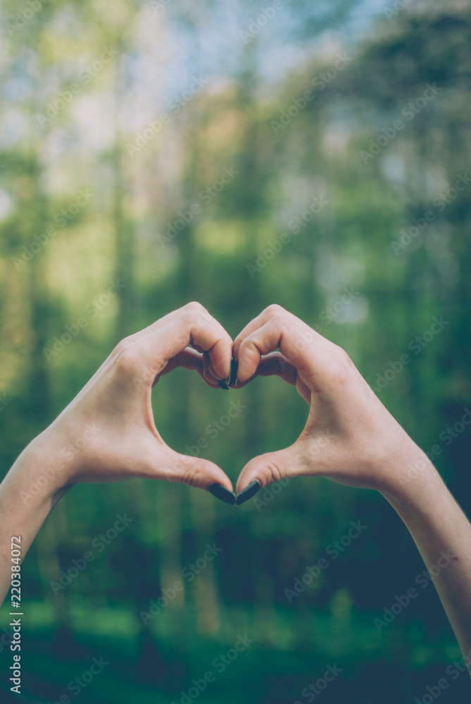 Girl demonstrating a heart shape gesture against spring forest covered with sunlight. Vintage retro colors