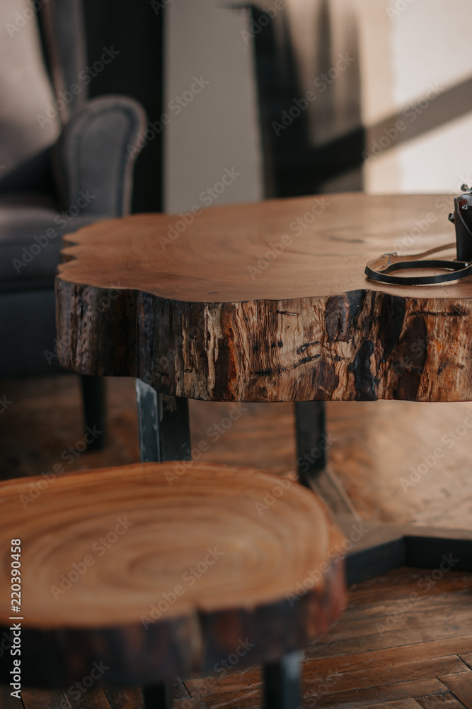 Tree. Wood carving. Wooden products. Interior. Beautiful decor. Style. Table. Elements of the interior. Loft style