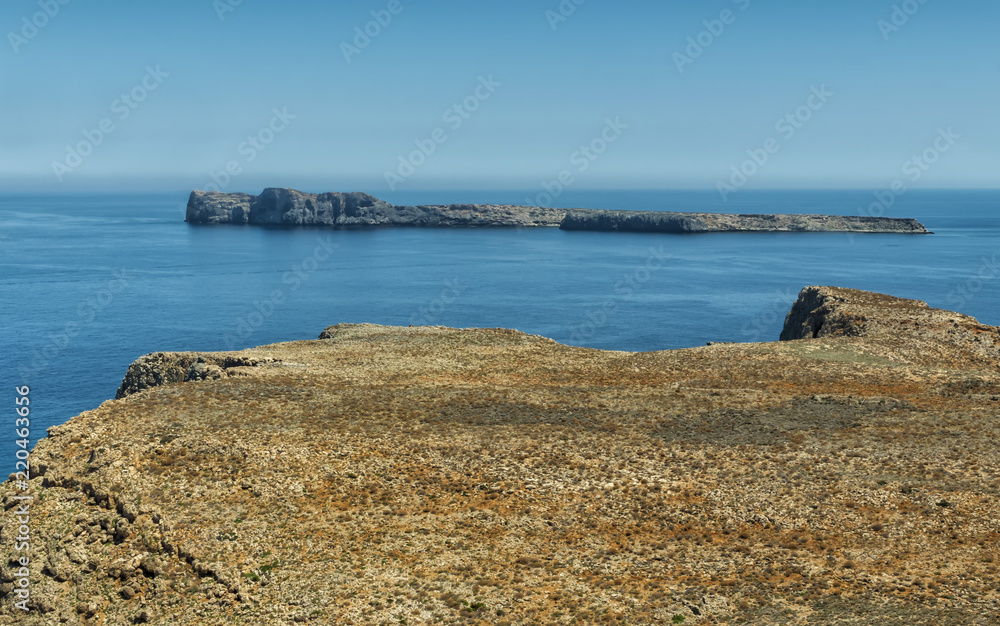 Panorama: Balos Lagoon Turquoise and Blue sea, view from the cliff of the island fort, Crete Island, Greece