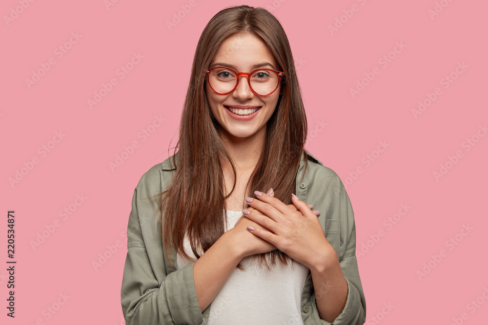 People, dedication and promise concept. Happy girlfriend keeps hands on heart, swears be loyal to boyfriend, expresses gratitude, wears spectacles, casual shirt, stands against pink studio wall.