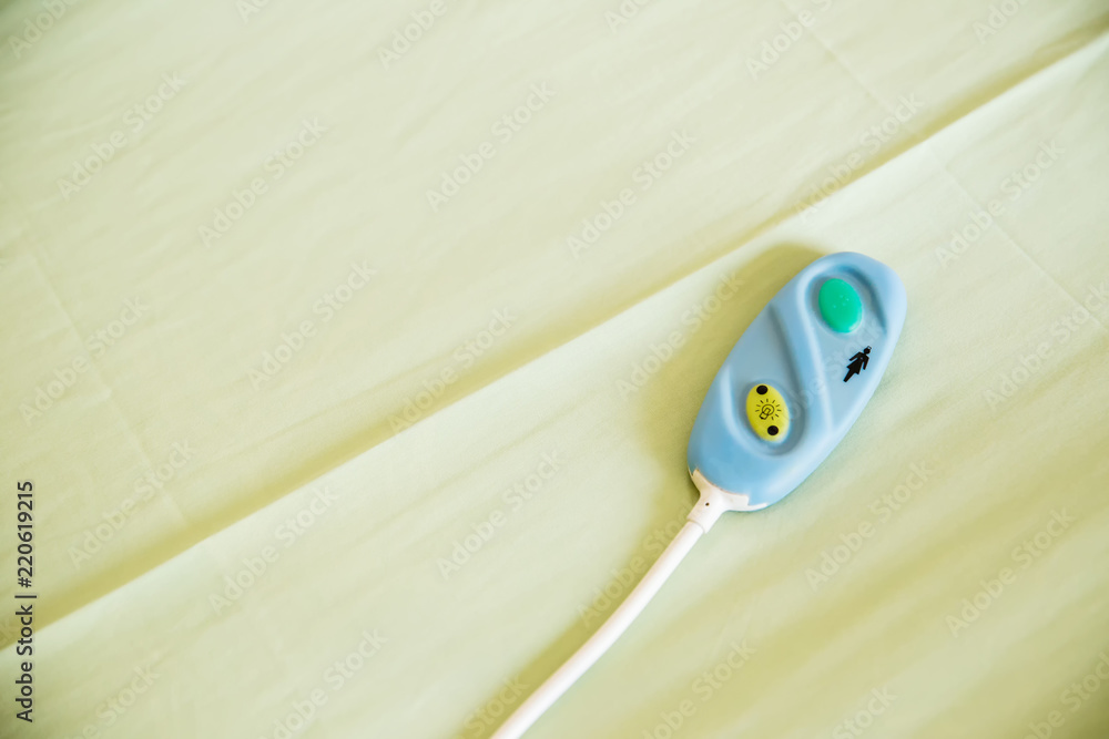 Focus emergency call to nursing ward button on the bed. emergency and help system in modern patient room. image for background, objects, illustration, article, sign of hospitality system.