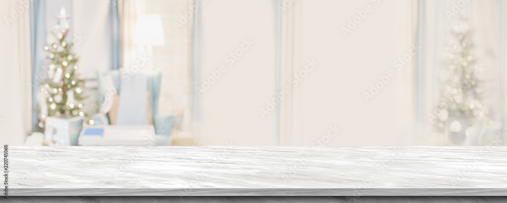 Empty grey marble table top with abstract warm living room decor with christmas tree blur background with bokeh light,Holiday backdrop,Mock up banner for display of advertise product ,luxury house.