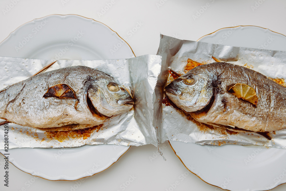 Two gilt-head bream fish on the aluminum foil on white table - view from above od delicious food homemade lemon filter vintage