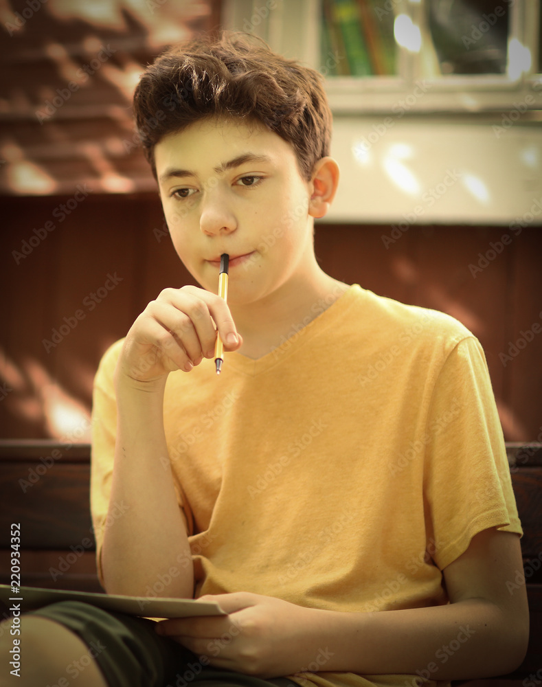 teenager boy close up thinking photo on blue