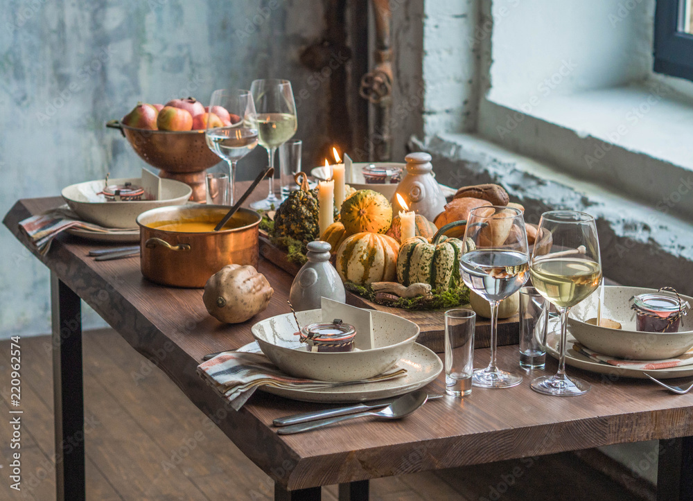 Table setting for Thanksgiving. Autumn table with pumpkins and candles in the center