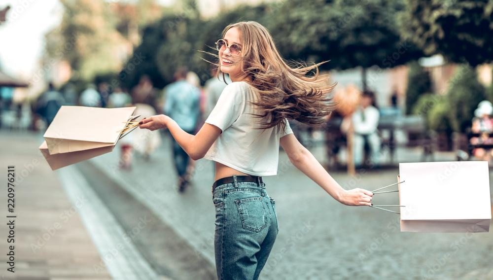 Shopping time! Happy young woman with shopping bags walking in the street.