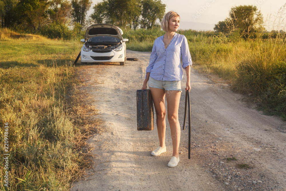 The beautiful girl driver in the car ran out of fuel, and she walks along a rural road with an empty fuel tank in the rays of the sunset. Toned