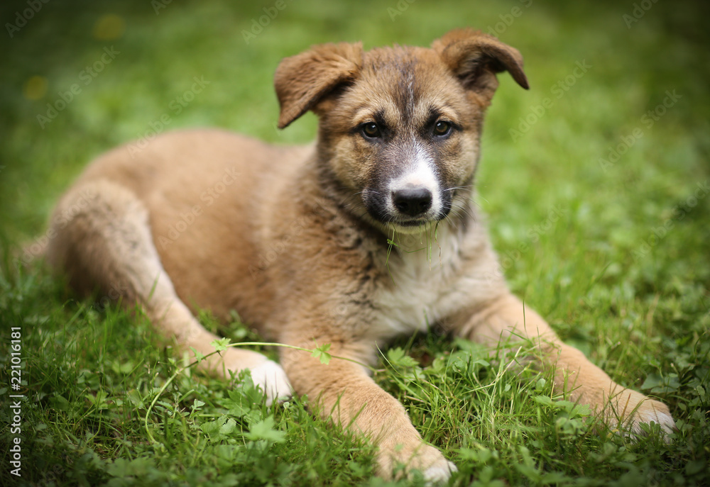 german shepherd puppy lay on green grass lawn with human hand