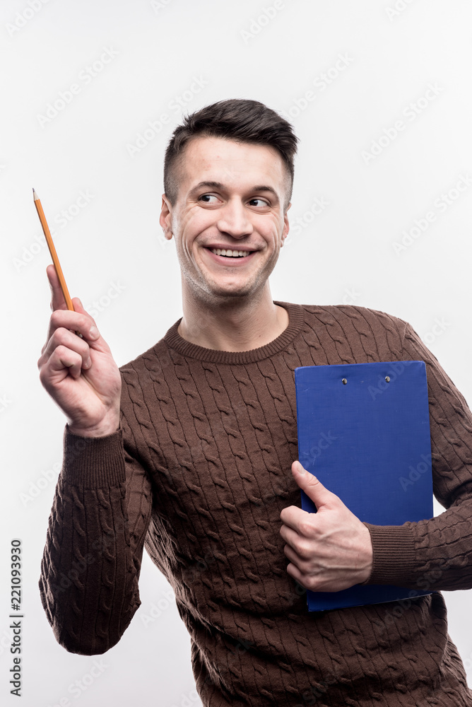 Inspired man. Dark-eyed handsome man feeling very inspired for new project on image without face retouching
