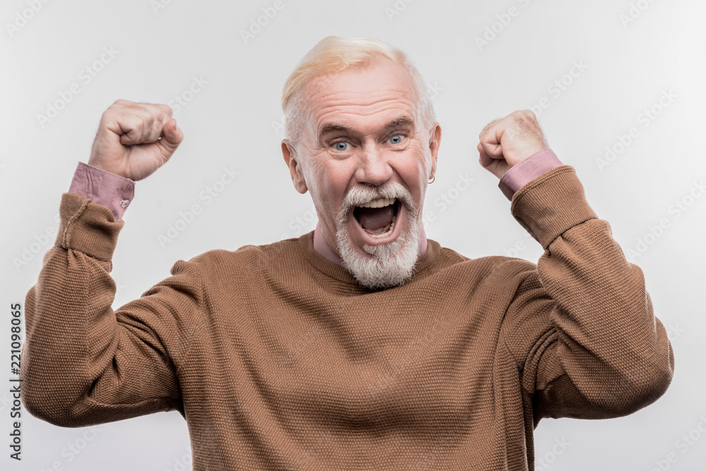 Cheerful man. Image without face retouching with blue-eyed aged man feeling extremely cheerful and happy after achieving success
