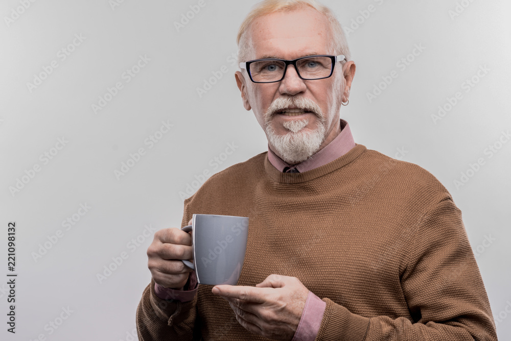 Businessman in glasses. Image without face retouching with elderly businessman wearing glasses holding blue cup with hot tea