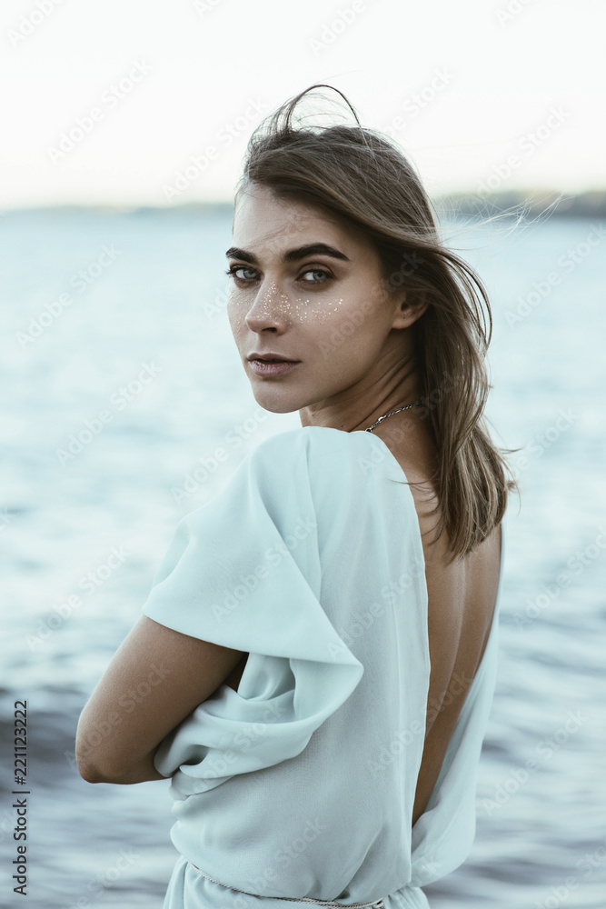 Beautiful and sensual woman with flying hair in the wind near the sea