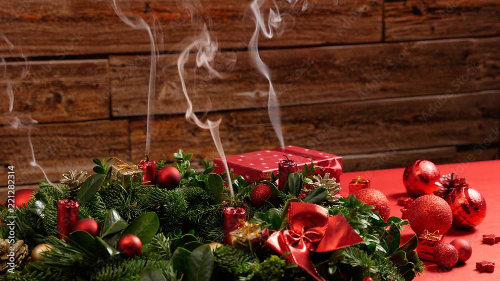 Advent wreath with four blown out fuming candles and festive decoration in front of a vintage wooden wall, studio shot with selective focus, copy space, no persons