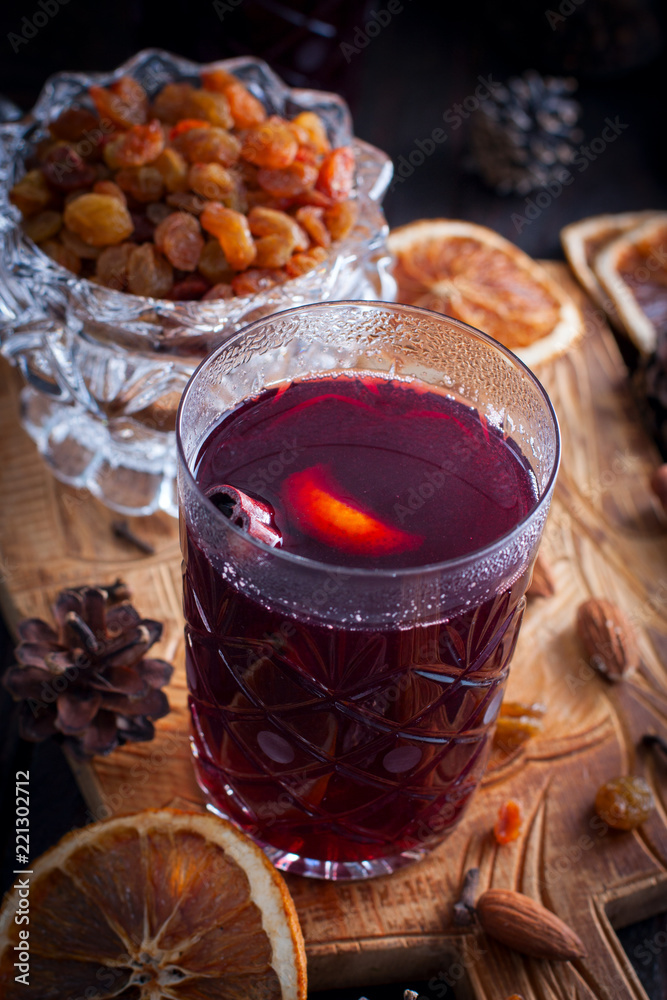 Scandinavian hot alcoholic drink with cinnamon in a glass cup on a wooden board, selective focus