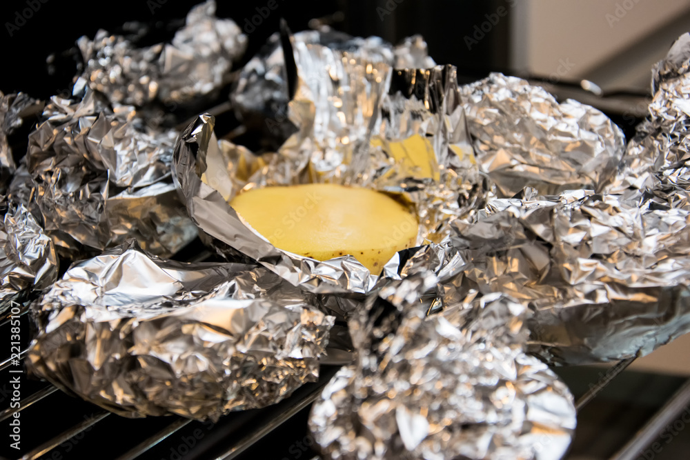 Halved potatoes wrapped in aluminum foil, lying on the grate of the oven.