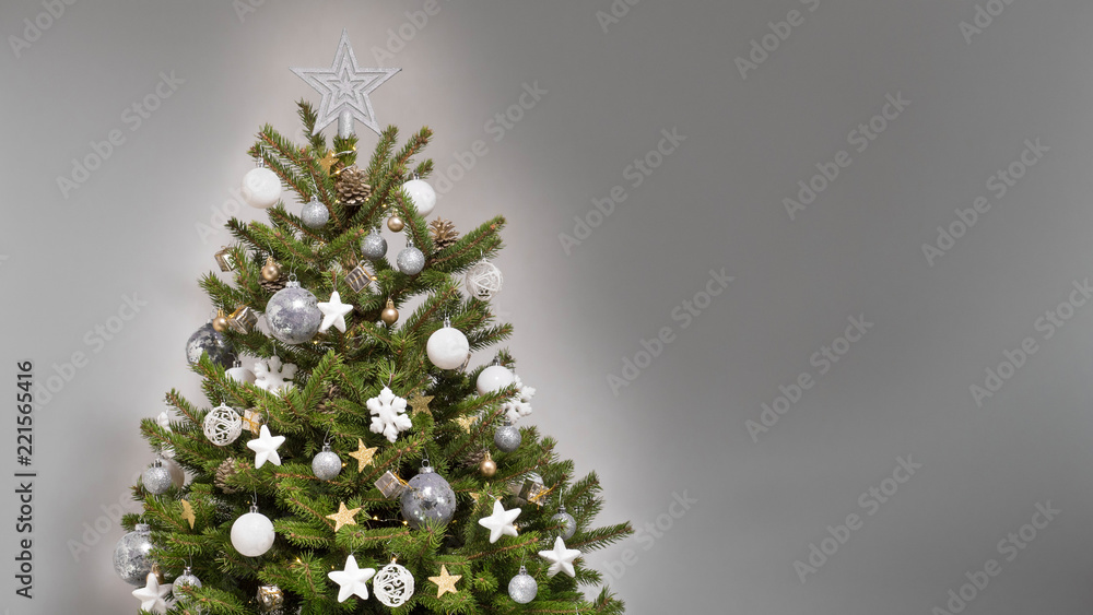 Modern design christmas tree with white, silver and golden decorations of sparkling glitter balls, stars, gifts, cones and fairy lights in front of a light gray background, copy space, nobody
