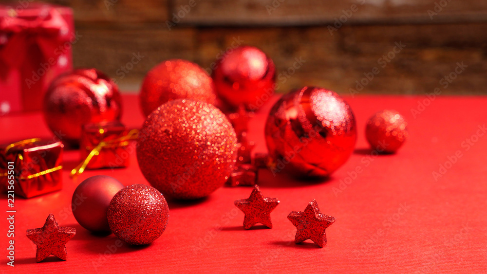 Shiny modern christmas decorations like baubels, stars, gifts and fir cones lying on a red table in front of an rustic wooden wall, copy space, nobody