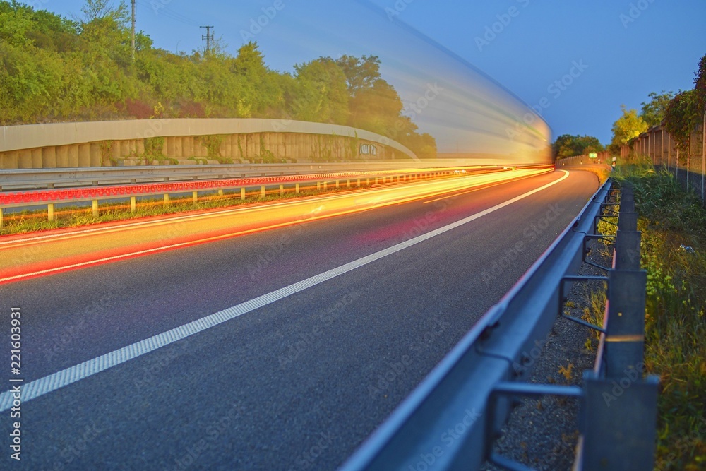 Highway at twilight with light trails. High traffic road with automobile light trails