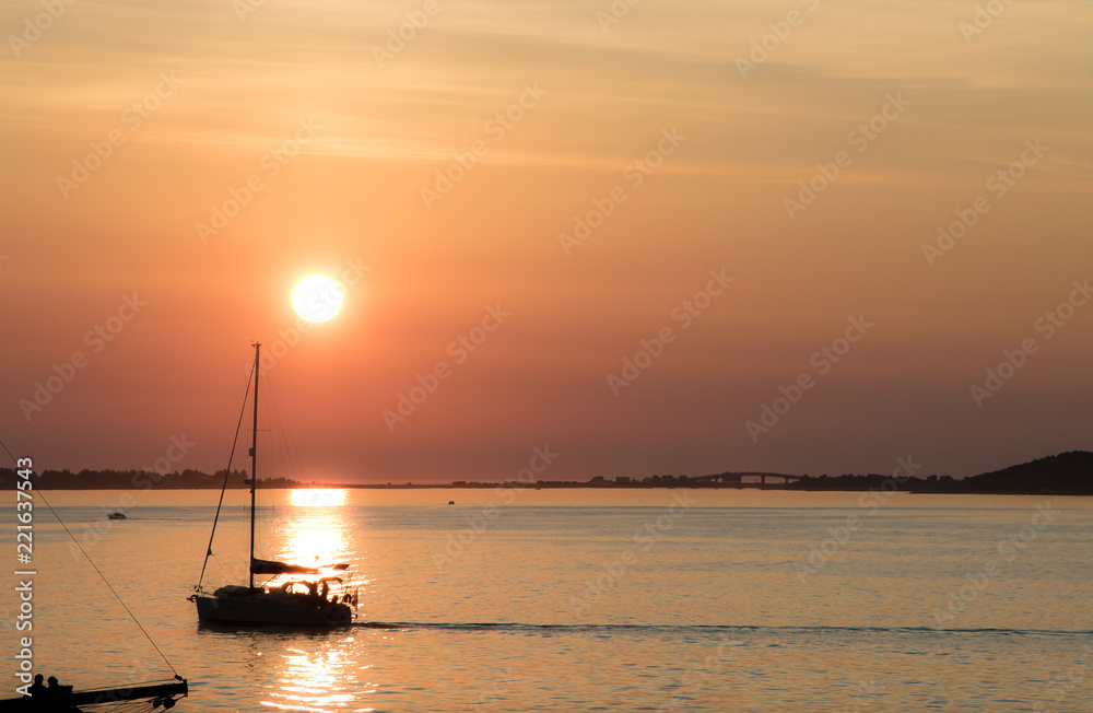 Small sailboat sailing by during a sunset at Alesund, Norway.