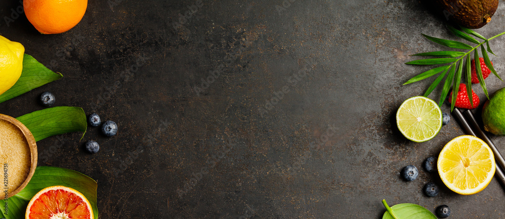 Cocktail making bar tools, tropical fruits and leaves on a dark