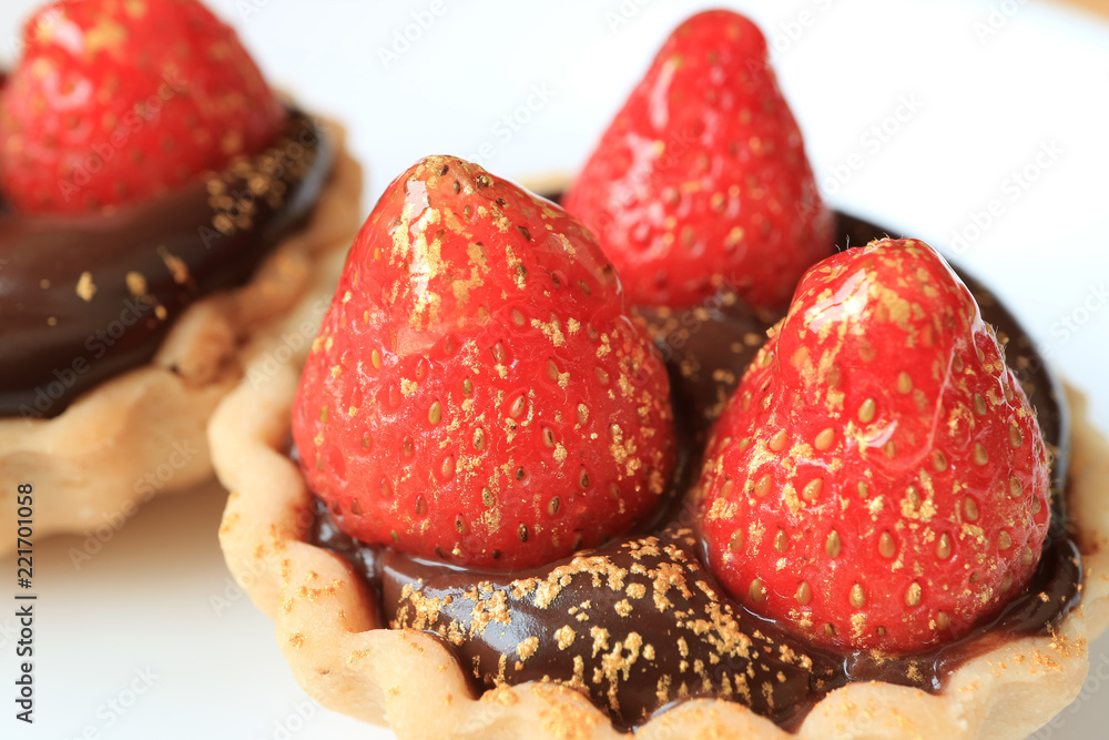 Close-up of chocolate tart topped with fresh strawberries and edible gold powder served on white plate