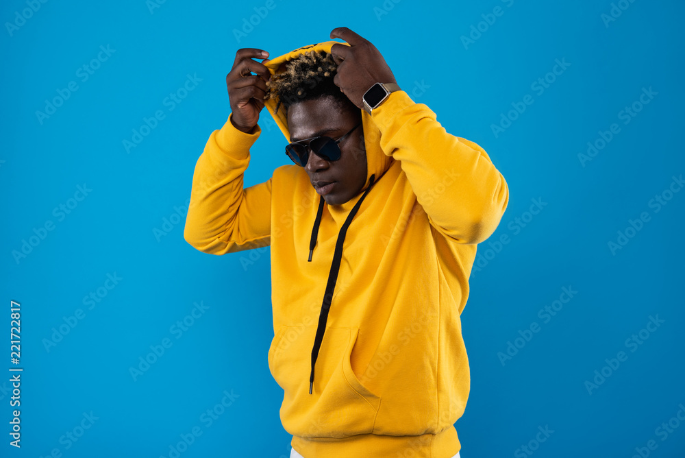 I am hiding. Waist up portrait of young wearing stylish yellow sweatshirt isolated on blue background. He is hiding dreadlocks under hoodie and looking down with serious expression