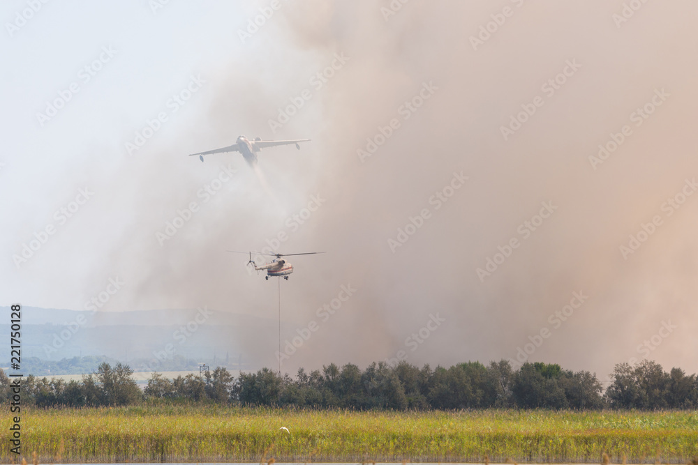 Joint firefighting by airplane and helicopter, on the floodplains of the Anapka River, Anapa, Russia