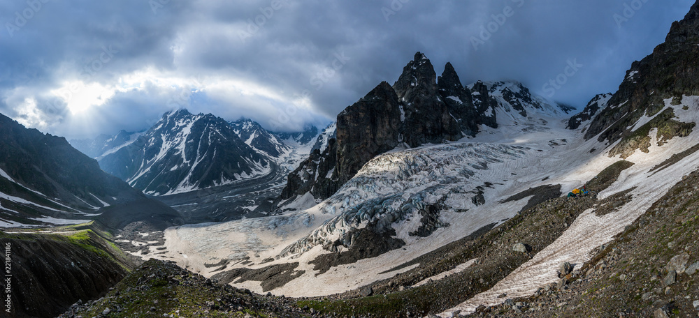 Summer mountain panorama in Western Caucasus. Ahsu glacier, snow covered mountains near Ushba and rocks against stormy sky.