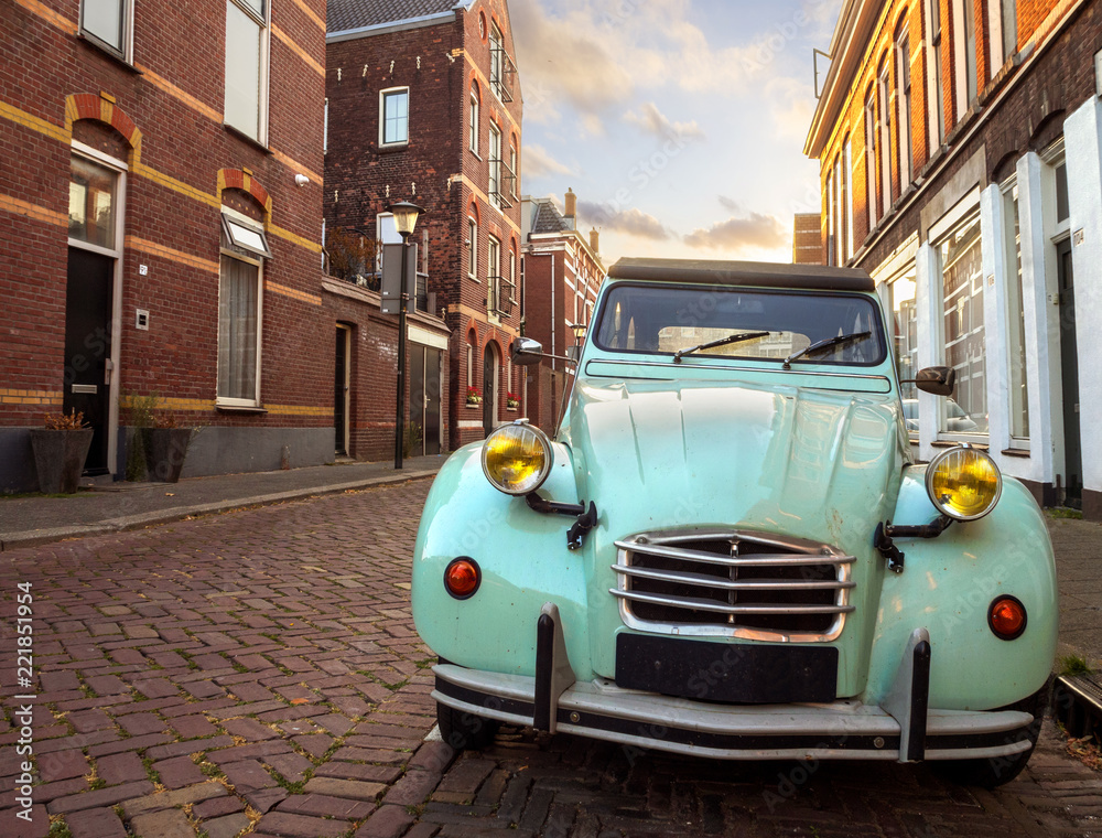 Beautiful retro blue car on the cobbled street of the Dutch city of Vlaardinger at dawn (Rotterdam, Holland, Netherlands)