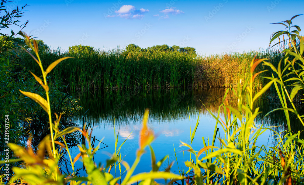 Photo of nature around beautiful blue lake, fishing place