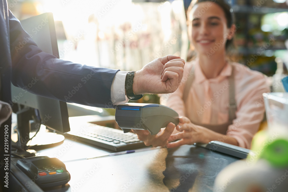 Side view closeup of unrecognizable businessman paying via smartwatch at counter in shop, copy space