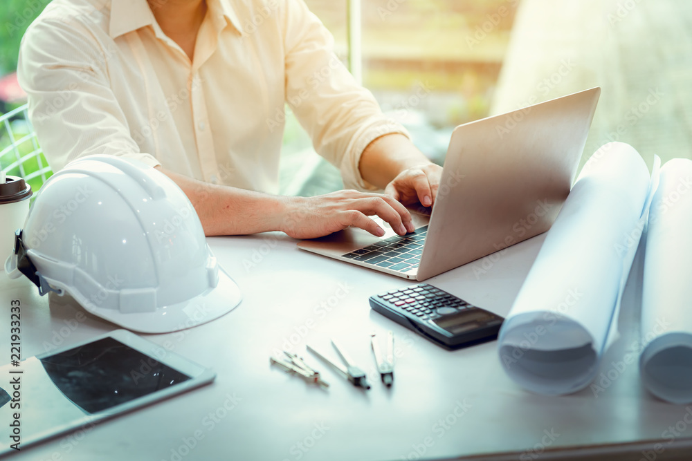 Close up portrait of civil engineer using laptop to planning project schedule, Engineering and construction concept
