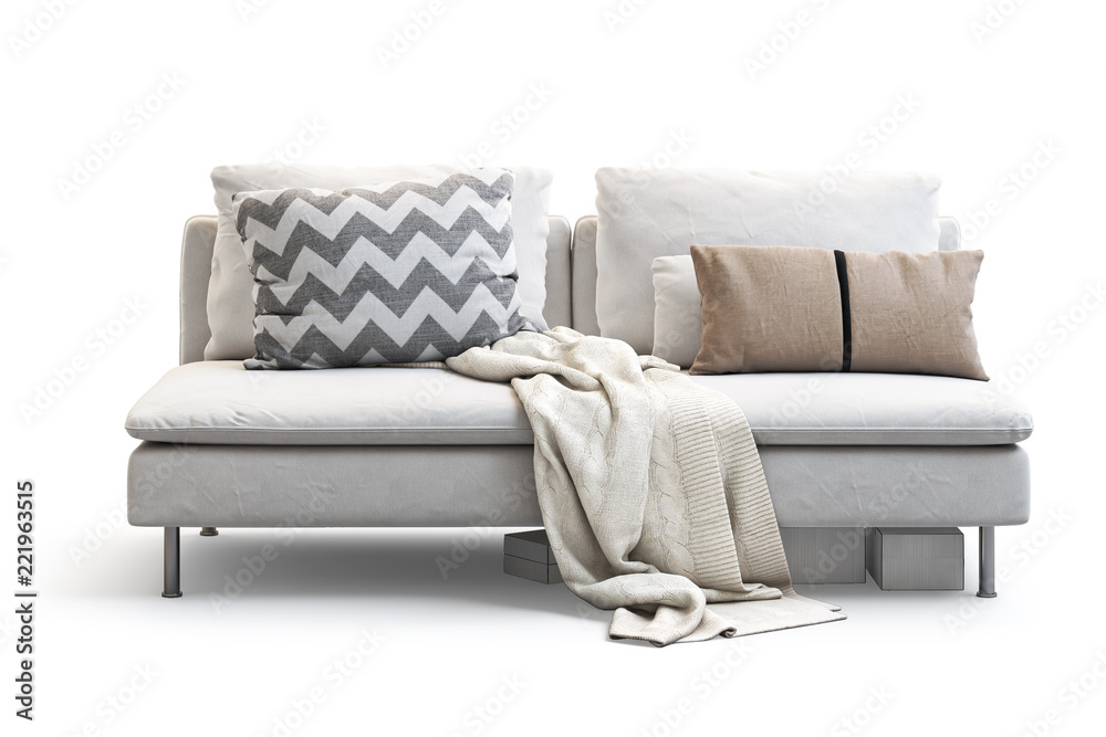 Modern white textile sofa with pillows and plaid. 3d render