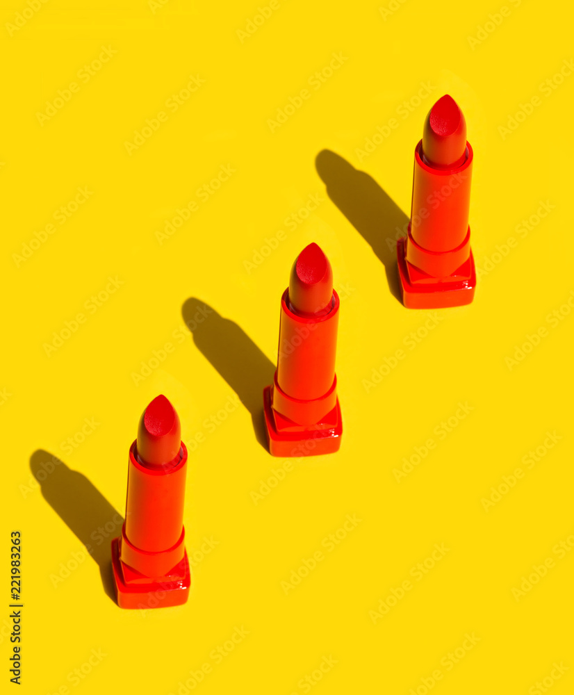 Three red crimson lipsticks arranged in diagonal on solid yellow background. Bright sunlight strong shadows. Creative minimalist funky style pop art. Poster banner design element copy space
